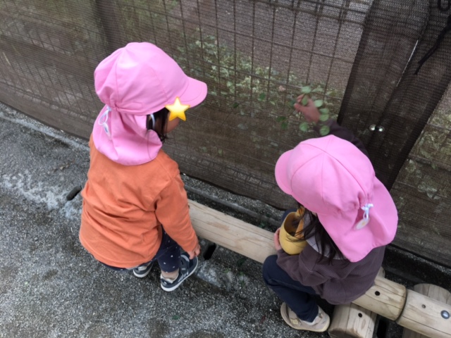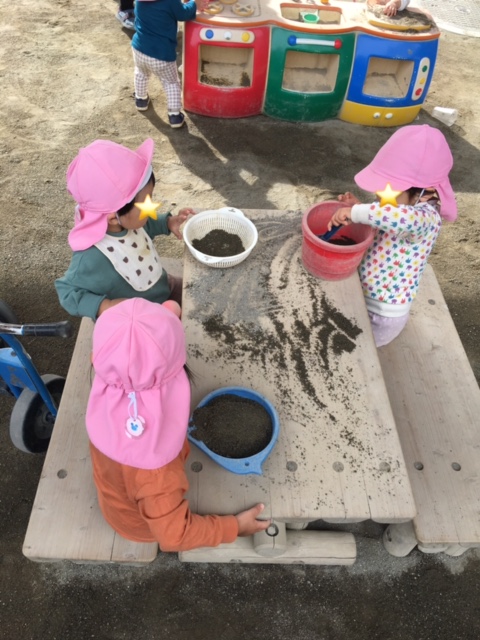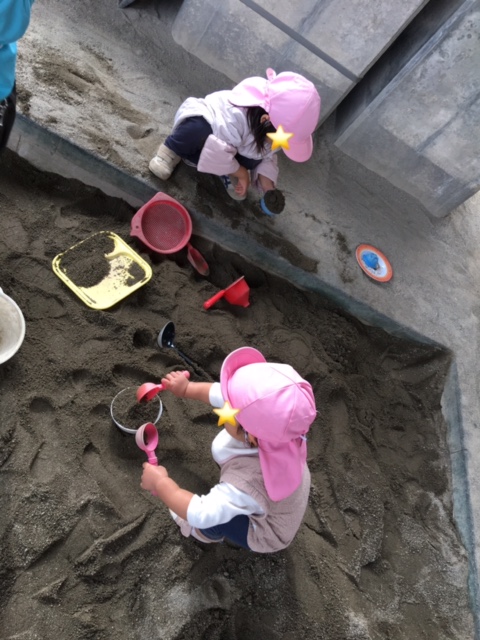今日は園庭とホールで遊びました。 お友達を見つけると横に座って一緒に遊びを楽しんでいるうさぎ組のお友達です。