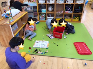 今日は幼児で一緒に遊びました。 室内遊びでは、ブロックやラキュー、 かるたなどをしました。 かるたはにじ組さんやそら組さんが読んでくれ、ほし組さんが絵札を取ったり、ブロックやラキューは「作ってあげるよ」と優しく教えてあげる姿が沢山見られました。