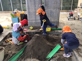 砂場では山づくり! みんなで大きな山や池を作って遊びました。
