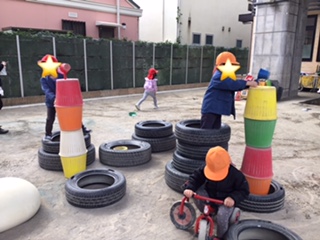 園庭遊びでは、バケツを重ねてスタンドマイクを作り「カラオケ!」といって、気持ちよさそうに歌っていました。