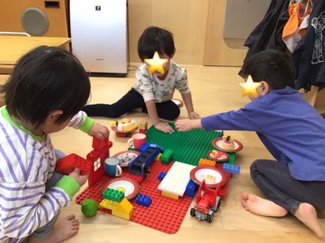 お部屋ではおままごとの食べ物と、ブロックを組み合わせて「お寿司屋さんにしよう!」と組み立ててお店屋さんごっこがはじまっていました。