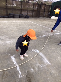 縄を真ん中にして、足はパーでジャンプして進み増した。