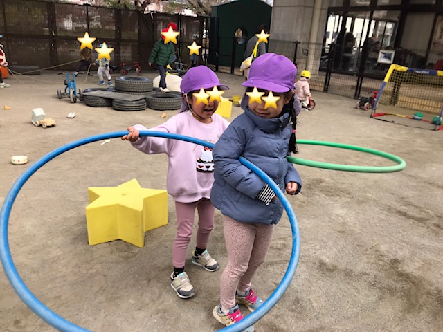フラフープを使って「おばけたいそうだよ」と言いながらお友達と創作ダンスをしていました。