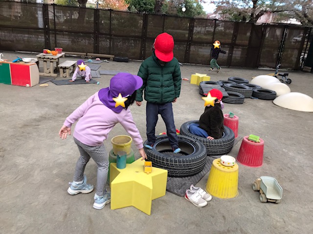 また、「ほうせきやさんですー!だれかきませんかー!」とお店屋さんごっこもしていました。「これくださーい!」と買いに来るお友達もいました。