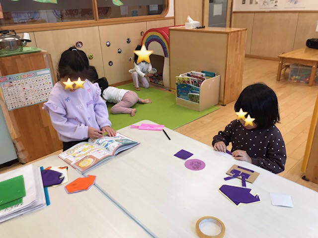 子どもたちはおうちごっこやなりきり遊びがブームで どうぶつやキャラクターになりきって遊ぶ姿が見られます。 また、なりきり遊びに使うアイテムを自分たちで作る姿もありました。