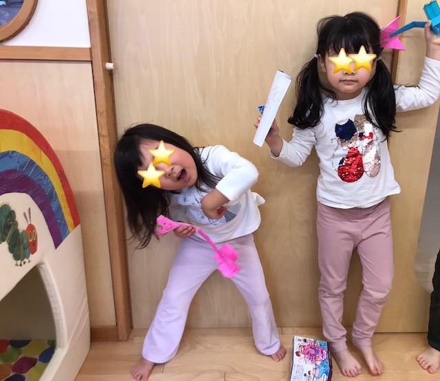 できたものを使って魔法使いになったり、ミュージシャンになるなどお友達と楽しく遊んでいました。