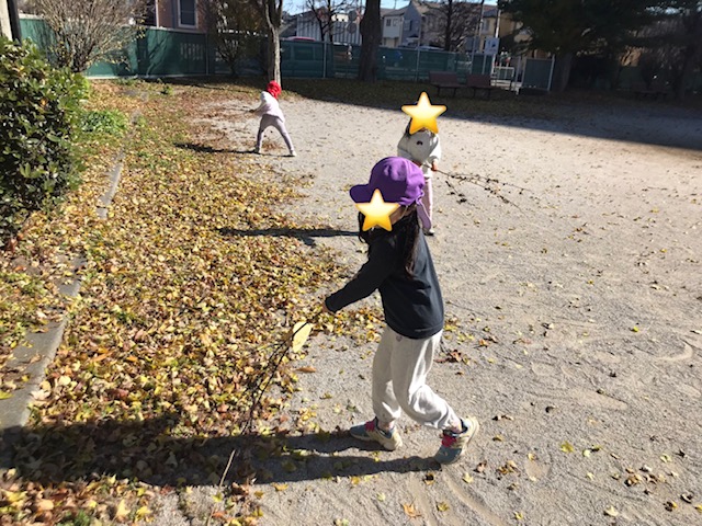 また、公園にある枝をほうきに見立てて葉っぱを集めていました。また、その枝にまたがって魔女ごっこも楽しんでいました。自然に触れながら考えて遊ぶ姿が見られましたよ。