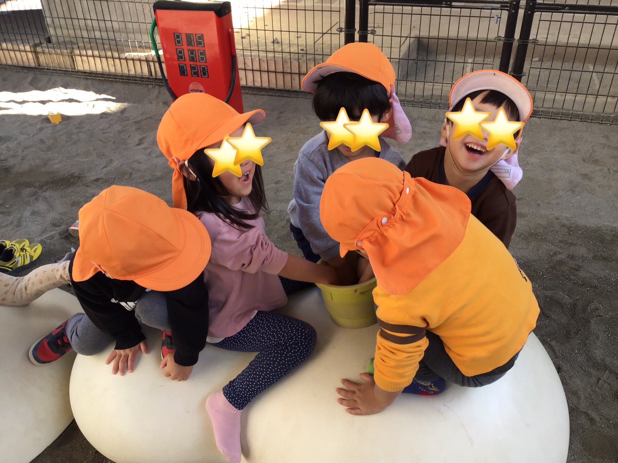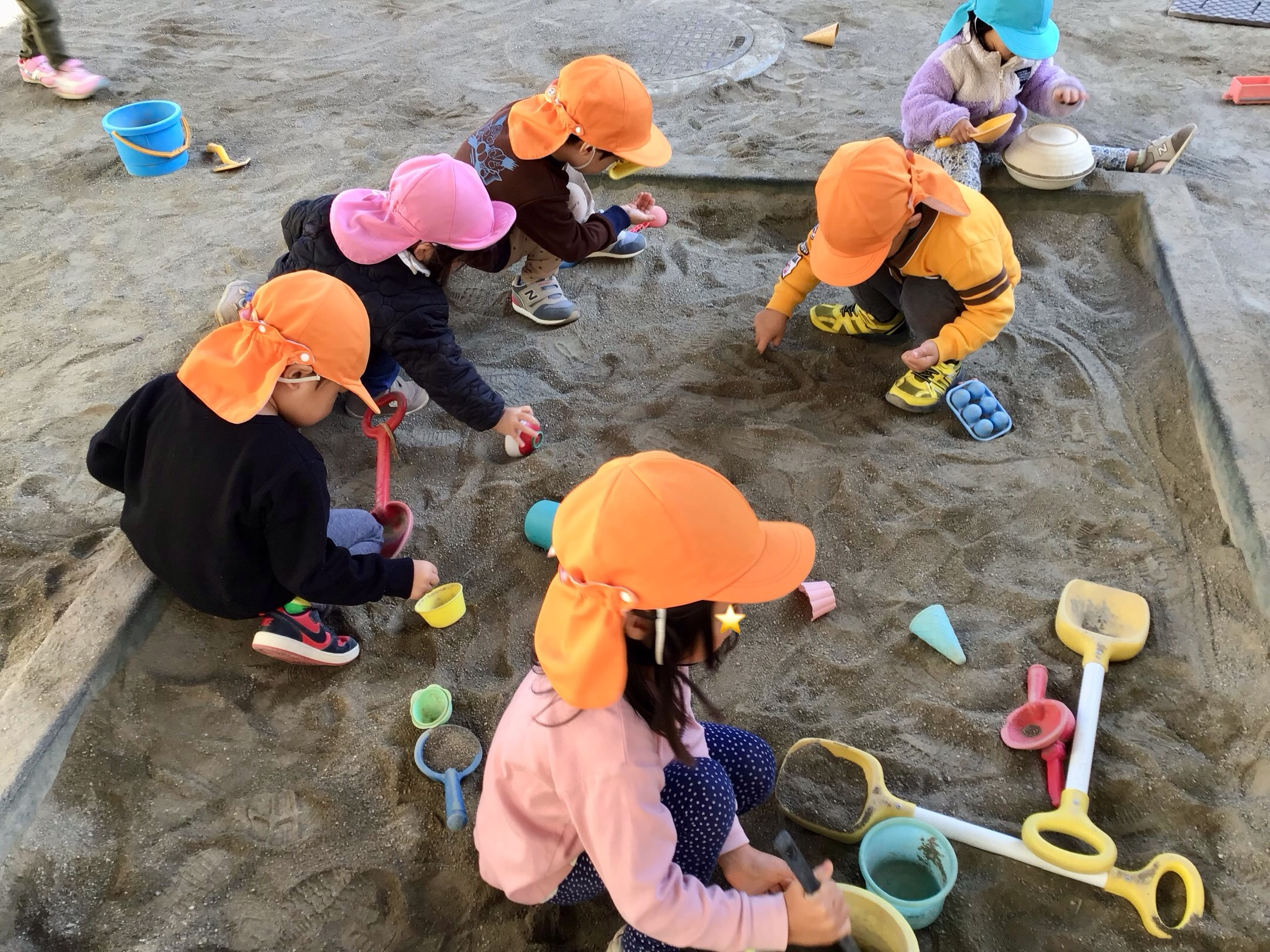 園庭では、「砂場でキラキラ探そう」とみんなで探し始めていました。 そのうち「小麦粉と牛乳と砂糖を入れて、、、」とお料理も。