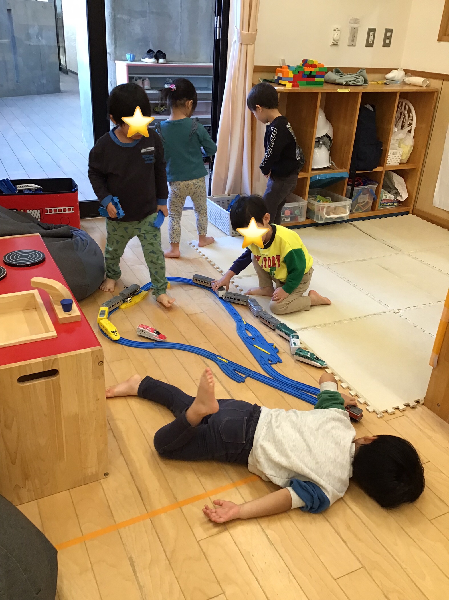 お部屋ではプラレール。どう繋いでいくかを話し合いながら、線路を繋げていました。