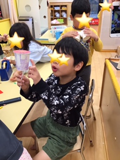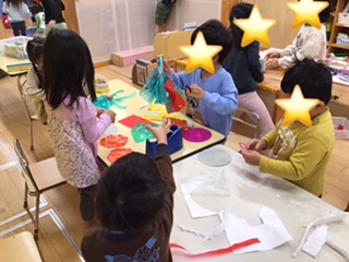 ほし組とにじ組で一緒に過ごしました。 画用紙や不織布、紙カップなど使って、制作遊びをたのしみました。