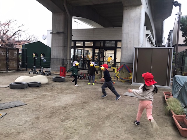 園庭では、自分たちで遊びを作り遊ぶ姿がありました。「ゲーム鬼ごっこ」と言ってゲームに出てくるキャラクターになりきっていました。「バリアは3秒」などみんなでルールを話し合いながら遊びを進めていく姿がありました。