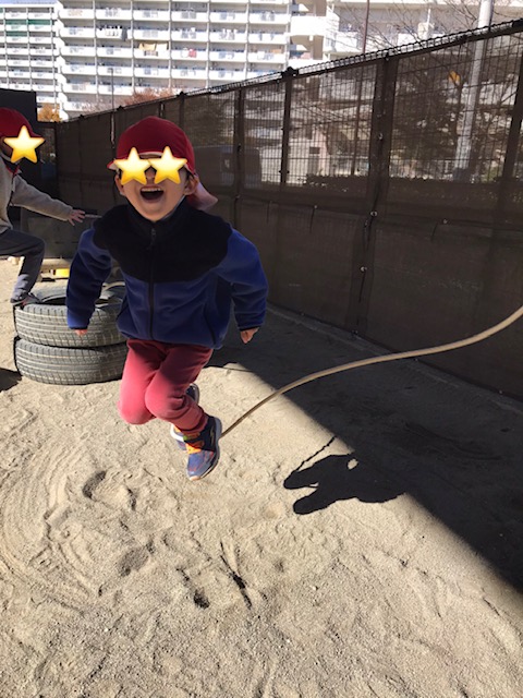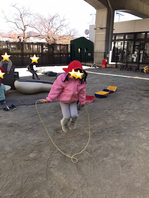 体育指導で行ってる縄跳びを自由遊びでも楽しんでいます。繰り返し頑張っているため少しずつ跳べる回数が増えてきました。