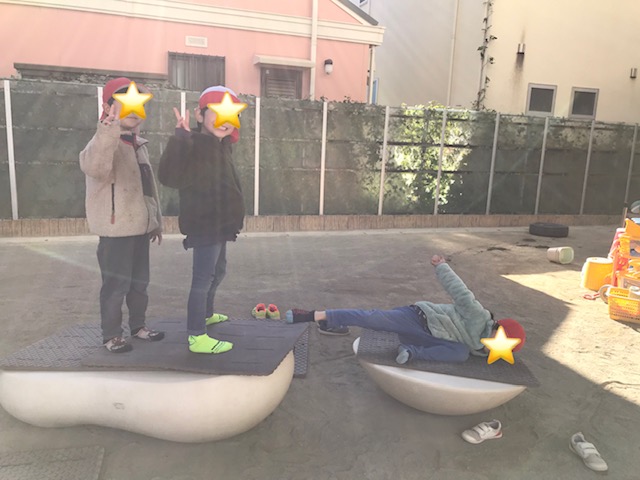 自分たちで遊び場を作ってアスレチックゲーム。バランスを取ったりジャンプで移動していました。