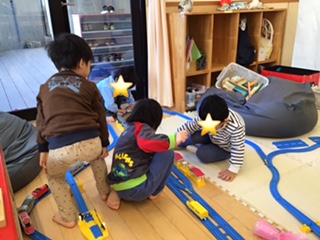 室内遊びではプラレールで遊びました。レールを長ーく繋げていました。「駅はこっちがいい」などお話をしながら、電車を走らせていました。