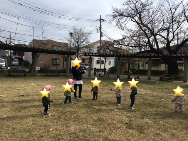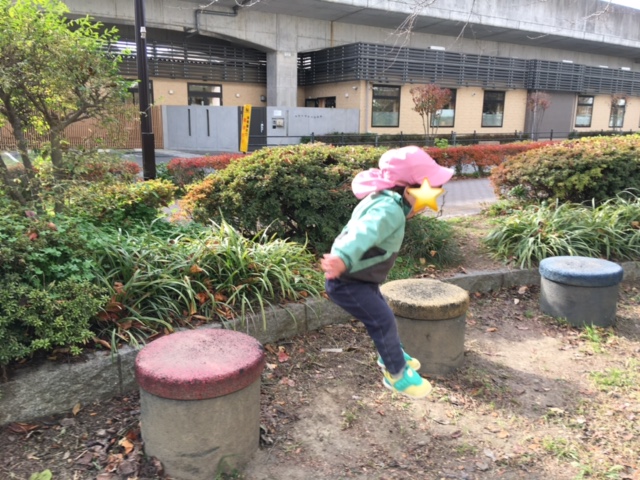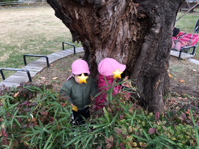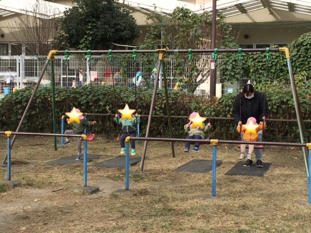 ひよこ組さんと一緒に北第二公園にお散歩に行きました。公園に到着するとすぐにブランコで遊んでいます。