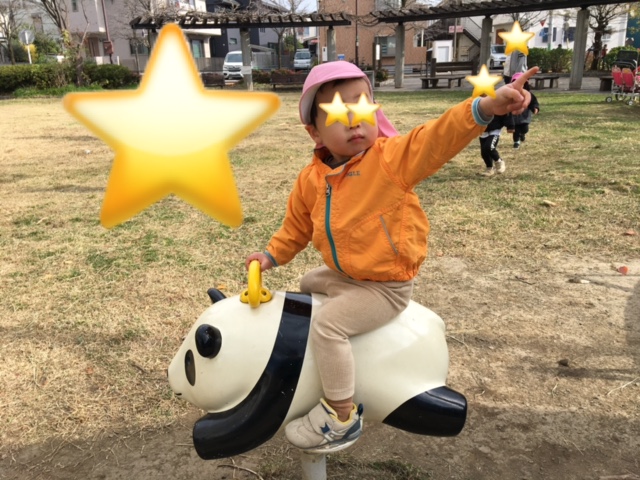 スプリング遊具で遊んでいると電車が通って教えてくれました。