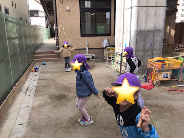 園庭で遊びました。 「縄跳びの練習する〜!」と体育指導でも取り組んでいる事に挑戦している子が多くいました。