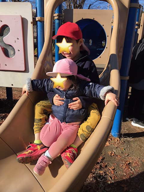 公園でも一緒に遊びました。 一緒に滑り台を滑ったり、かけっこをしていました。普段からお世話をしてくれているので、上手に遊んでくれました。