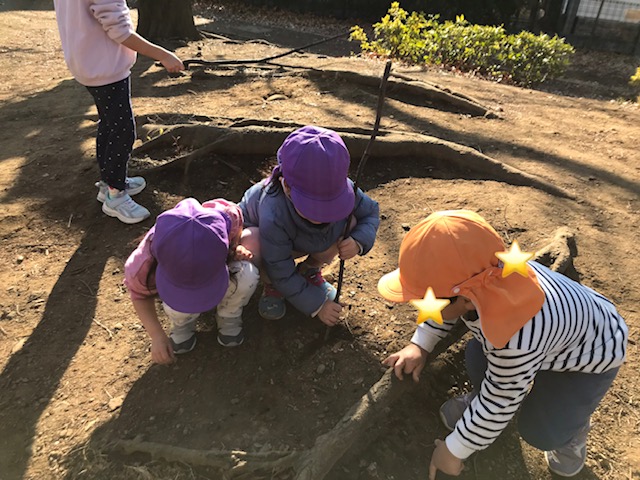今日は中ふれあい公園にお散歩に行きました。 「みてみて!ありのすがある」と言ってお友達とありが出てくるか観察していました。 なかなかありは出てこない様子で「さむいからねてるのかもね」とありの気持ちを考えている姿がありました。