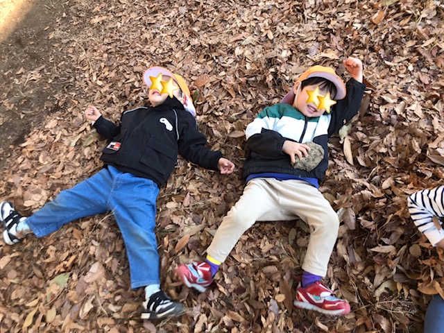 また、落ち葉を集めてベットを作り、お友達と寝転がってみました。 「やわらかい」と寝心地の感想を教えてくれました。