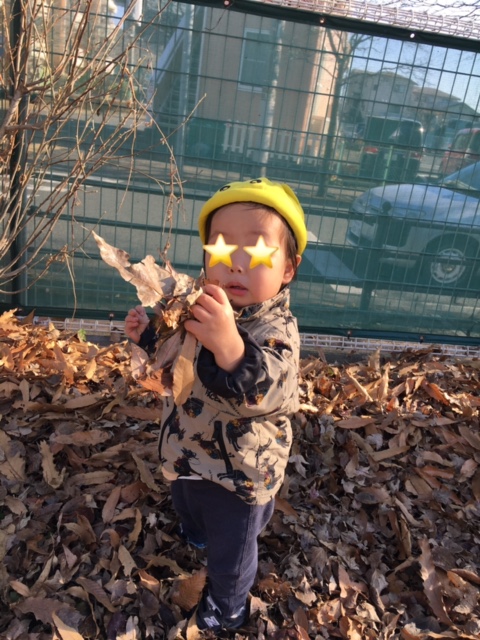 お散歩先の公園の落ち葉が沢山ある場所で大きな落ち葉を見つけました!