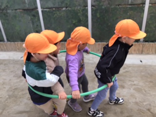 園庭ではフラフープを電車にして、走らせていました。 あっという間に満員電車になってしまいました。