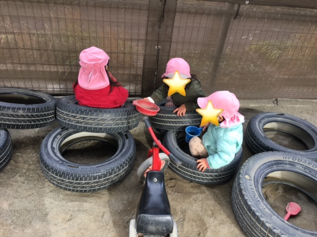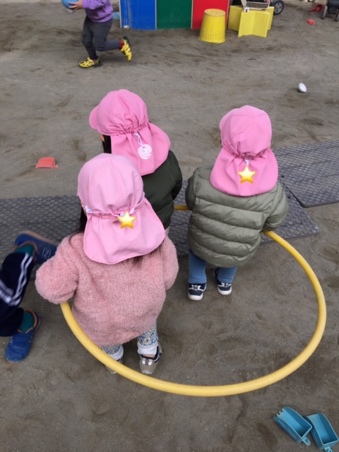 1つのフラフープに入って、電車の出発です。「ガタンゴトン〜ガタンゴトン〜」と言いながら園庭を歩いて回りました。
