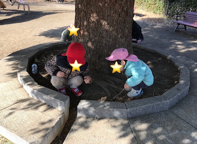 虫探しも始まって、「カメムシがいた〜」と話していると、うさぎ組のお友達も観察したり、