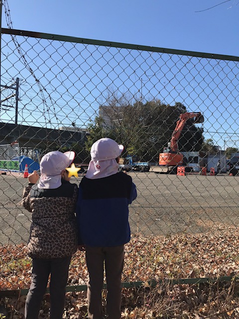 公園横では、小型クレーン車が木材を運んでいて、工事の様子に釘付けでした。