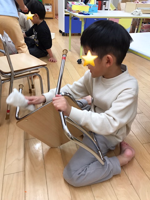 一月一日に新しい年に変わる事を伝えてから新年を綺麗なお部屋で迎えるために、たくさん使ったそら組のお部屋を大掃除をしました。 ロッカーやお道具箱など自分の物以外にも、玩具の棚や机だと全て綺麗に拭いてくれました。