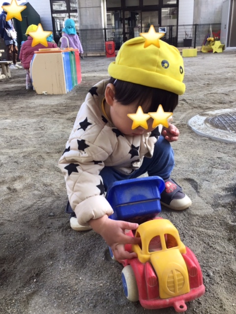 車の玩具の運転席に玩具を入れて走らせていました。運転手さんかな?
