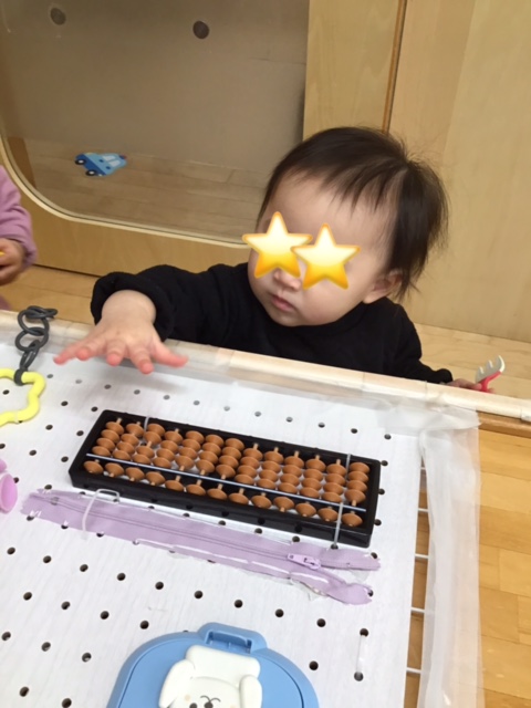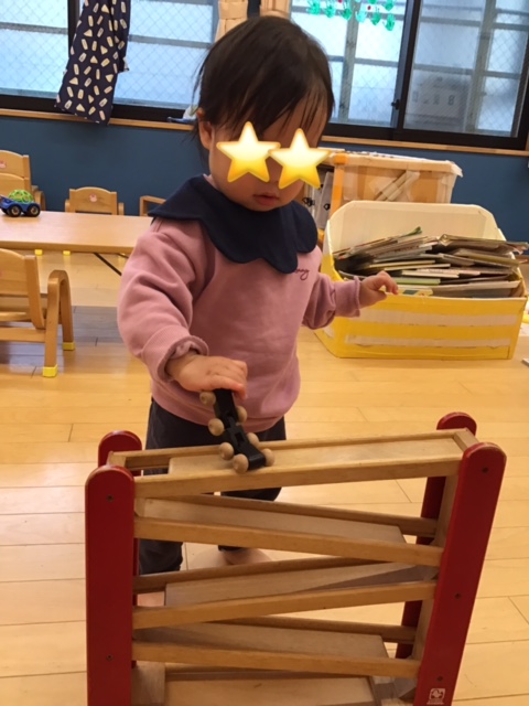 うさぎ組さんのお部屋にもお邪魔しました。ひよこ組にはない玩具に興味深々です。