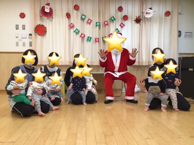 サンタさんの登場に驚きながらもクリスマス会には楽しそうに参加していました。