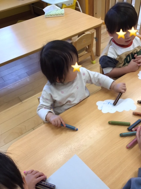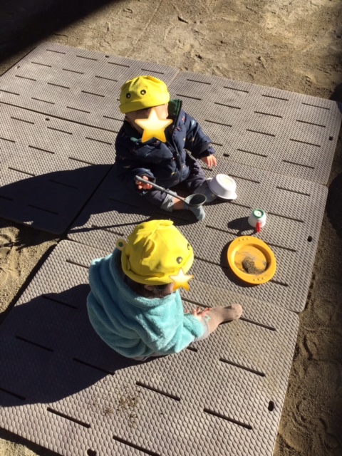暖かい場所で日向ぼっこをしながら砂場のおもちゃを持って遊びました。