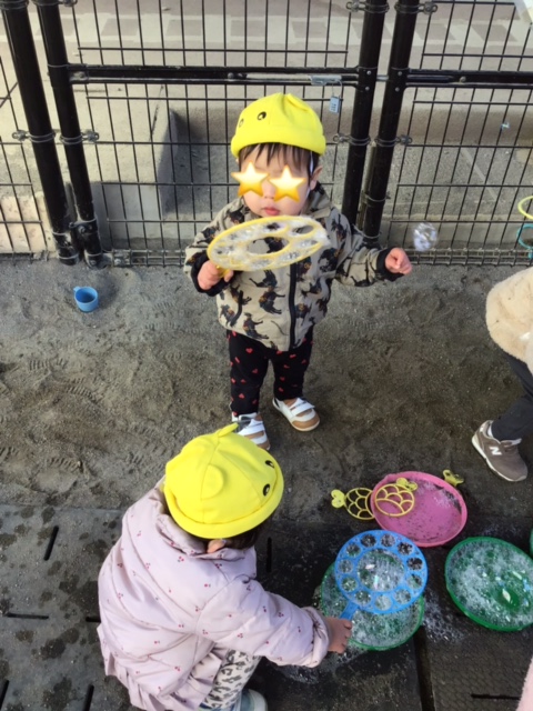 他のクラスのお友達や保育者を見ながらシャボン玉が上手に作れました!