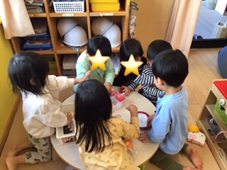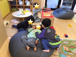 室内遊びでは、お医者さんごっこが始まり、沢山のお医者さんがいました。それぞれの役割があって、患者さんはよく診てもらっていました。