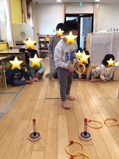 輪投げをしました。入ると嬉しそうにしていました。「もう一回やりたーい!」と言っていたので、もう一回輪投げをしました。