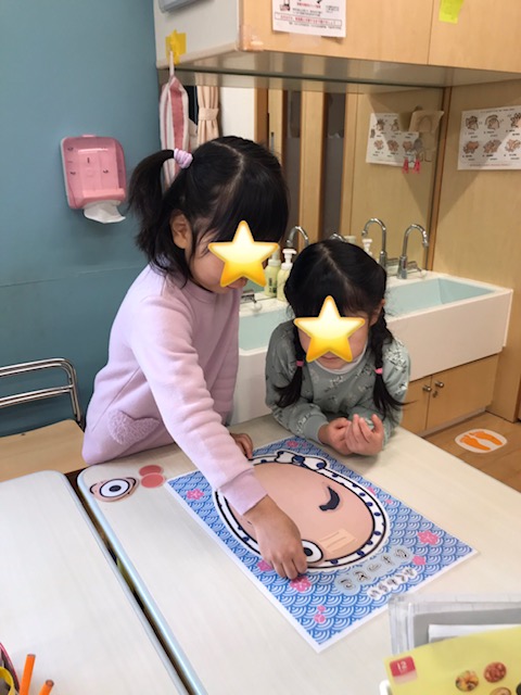 朝は、昨日も遊んだお正月遊びの福笑いやこま回しを友だちと一緒に遊び始めていました。
