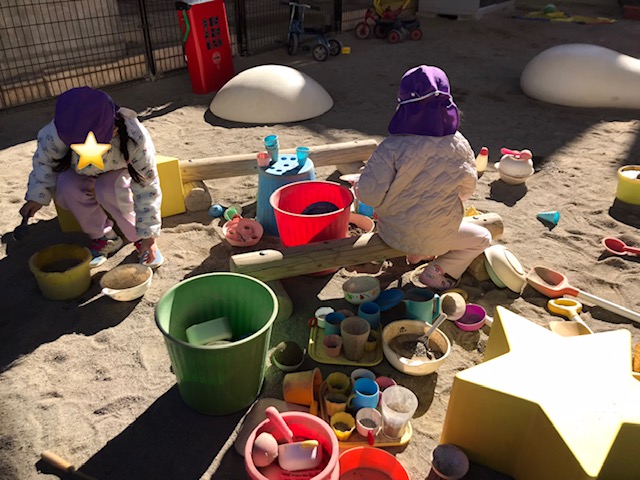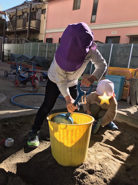 園庭ではもちつきをしたことを思い出して、砂をバケツに入れて見立てながら混ぜたり叩いたり。