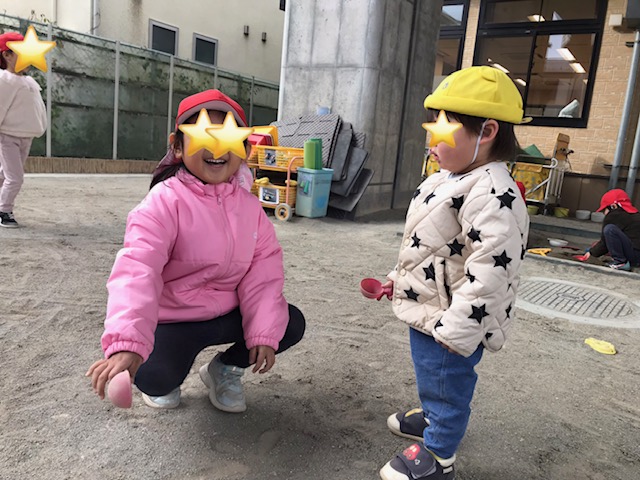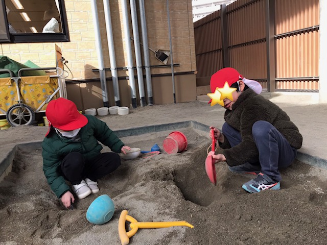 砂場では、「どこまで掘れるかな?」と2人で協力しながら掘り続ける姿がありました。