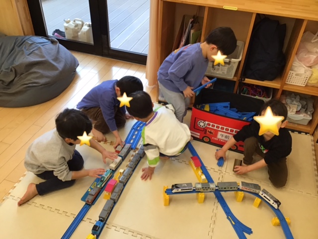 お部屋ではプラレールの線路作りも。「あ、思いついた!」「こっちにしよう!」と考えたことを伝えたり実際に作ってみたりと、友達と一緒に作り上げていました。