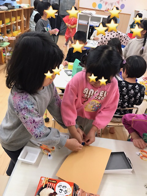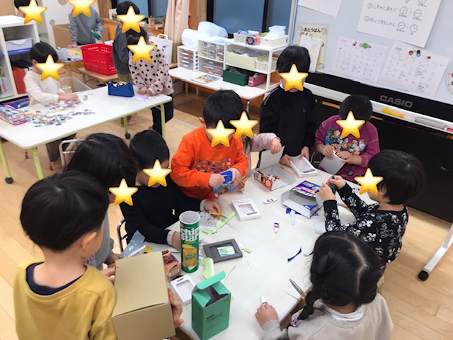 空き箱や折り紙などいろんな素材を使って工作遊びをしました。 初めてなので今日はそら組さんに廃材遊びを教えてもらいました。