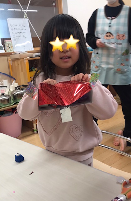 「おかしばこをつくったら?」 「ここにキラキラのおりがみはったらかわいいんじゃない?」とたくさん教えてくれました。