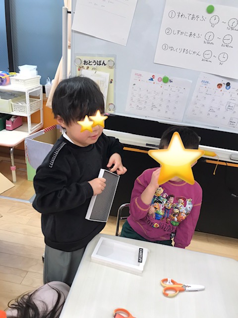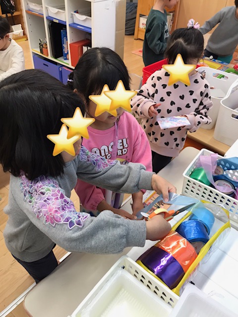 普段そら組が楽しんでいる廃材遊び。今日からにじ組さんも廃材遊びに挑戦するそうなので遊び方など教えながら一緒に楽しみました。 「こうすると切りやすいよ!」とアドバイス!