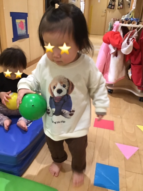 ボールを抱えて持っていて上手に投げることができました。