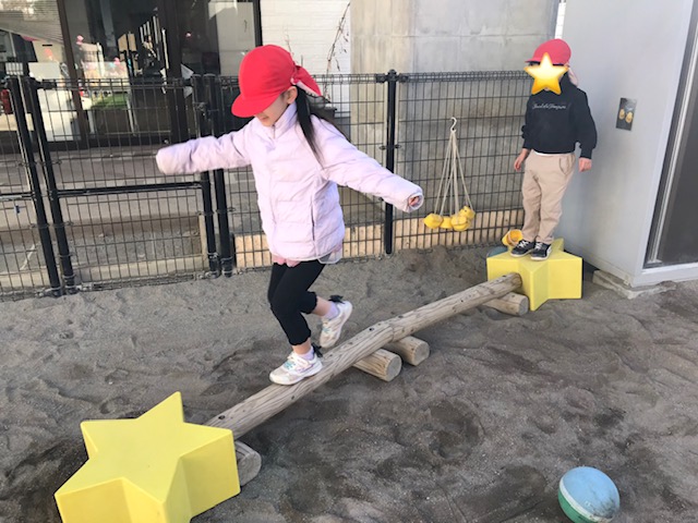 自分達で道を作って綱渡りを楽しんでいました。「ここ簡単だから、もっと難しくしよう!」と相談しながら作っていましたよ。