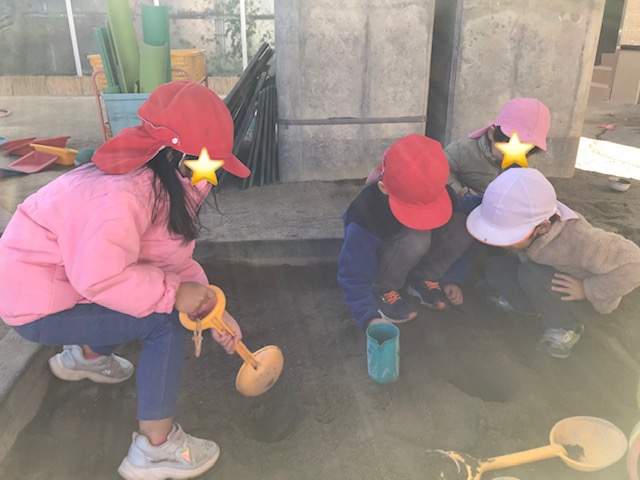 他のクラスのお友達と一緒に穴を掘って、どんどん水を入れていました。水が溢れるたびに笑い声がして、楽しそうでした。