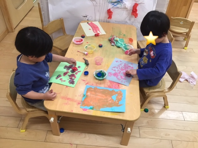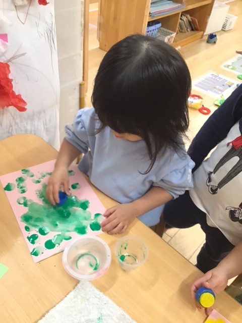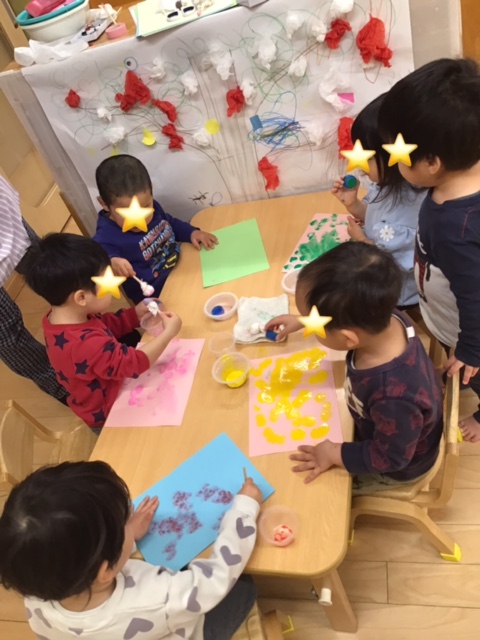 絵の具遊びもしました。 スタンプでポンポン押して好きな色を重ねて遊びました。