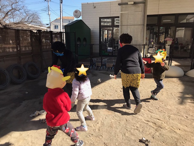 最後に園庭で豆まきごっこをしました。 新聞で作ったボールを豆に見立て、「おにわそと!」の掛け声でたくさん投げていました。