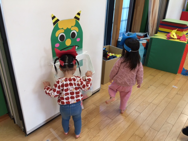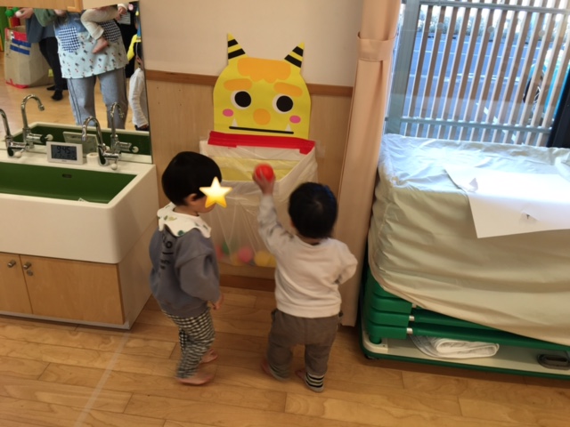 壁に貼られている鬼に向かって「おにはーそと」と上手にボールを投げたり、優しく鬼を撫でているお友達もいました。